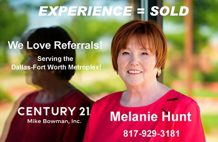 With thirty years of real estate experience, Melanie Hunt is comfortable working in any type of market. Forward thinking and flexible, Melanie easily adapts to the ever changing DFW real estate market and the latest technological changes.